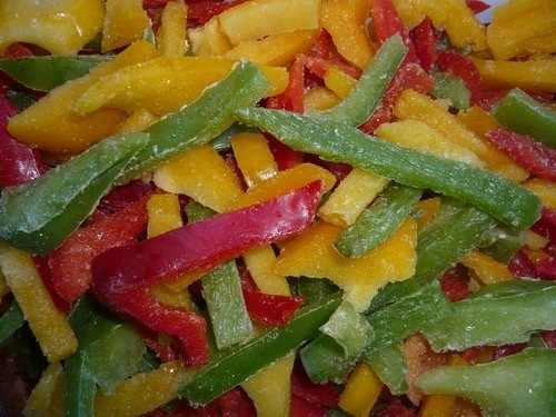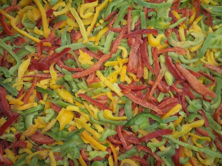 IQF полоски красного перцасбор, в кратчайшие сроки на место переработки, обработка, а затем быстрая заморозка отдельных экземпляров, охлаждение в небольших упаковках.